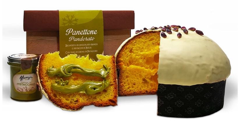 Panettone Soft pandorato recouvert de chocolat blanc et entier pistache sicilienne, fabriqués à la main et fait avec des produits de haute qualité, sans colorants et sans conservateurs, ce qui en fait un dessert avec un parfum unique et la bonté. A déguster avec la crème de pistache 45% présente dans l’emballage.